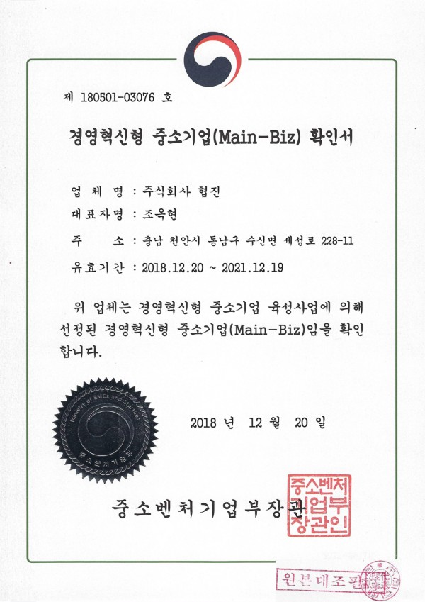 • 첨부 메인비즈 인증서원본대조필.pdf (689.2K) 123회 다운로드 DATE : 2019-05-24 15:56:58